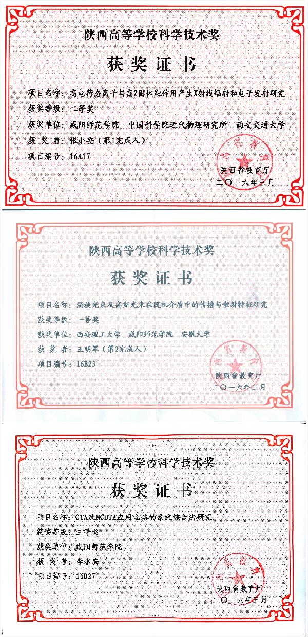根据陕西省教育厅《关于对2016年度陕西高等公司科学技术奖的通知》(陕教技【2016】3号),公司3项科研成果(主持完成2项,参与1项)获2016年度陕西高等公司科学技术奖励,其中王明军教授参与完成的《涡旋光束及高斯光束在随机介质中的传播与散射特征研究》获得一等奖,张小安教授主持完成《高电荷态离子与高Z固体靶作用产生X射线辐射和电子发射研究》获得二等奖,李永安教授主持完成的《OTA及MCDTA应用电路的系统综合法研究》获得三等奖。