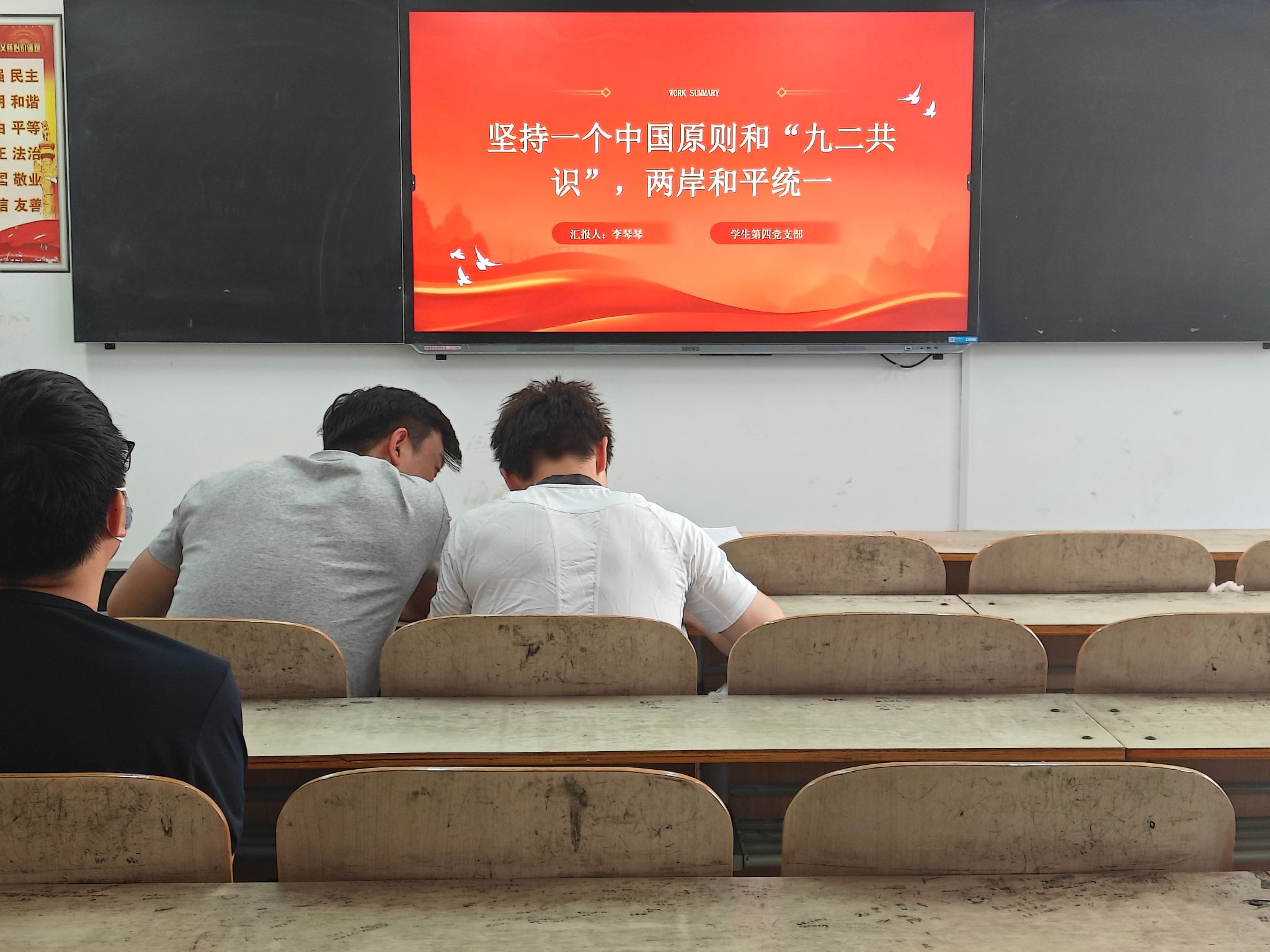 员工第四党支部李琴琴同志以坚持一个中国原则和九二共识,两岸和平统一为题,讲述在国务院总理李强所作的政府工作报告指出,要坚持贯彻新时代党解决台湾问题的总体方略 ,坚持一个中国原则和“九二共识”,这是发展两岸关系的政治基础。报告坚决反对“台独”分裂和外部势力干涉,积极推动两岸关系和平发展。同时完善交流合作制度政策,深化两岸融合,增进同胞福祉,坚定不移推进祖国统一大业,携手共创民族复兴。