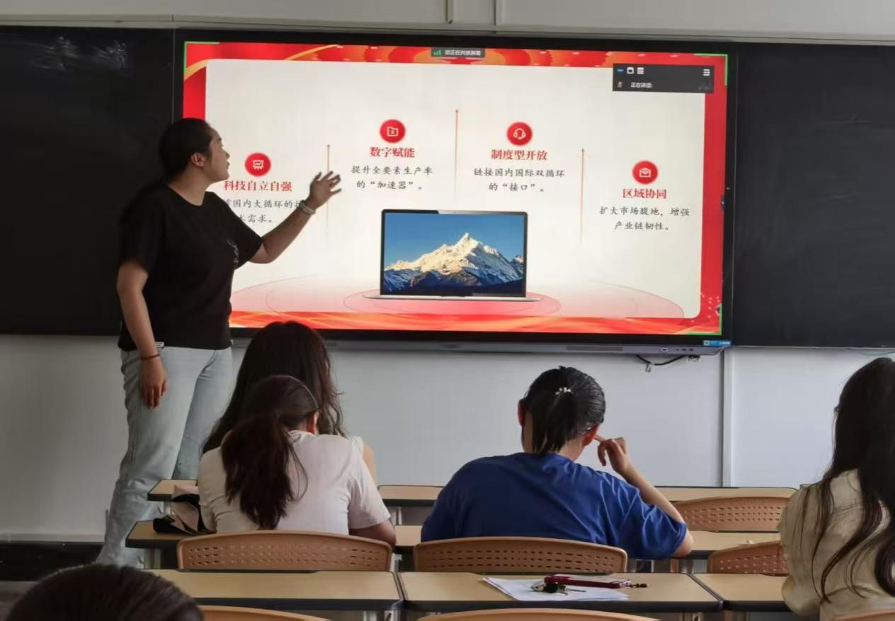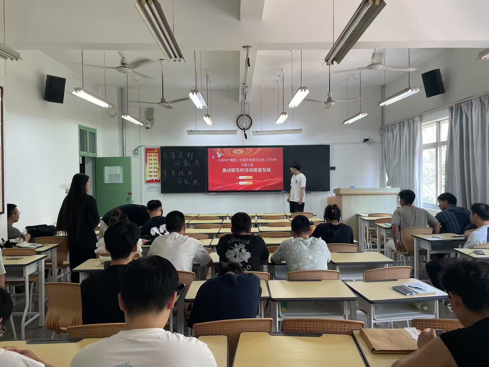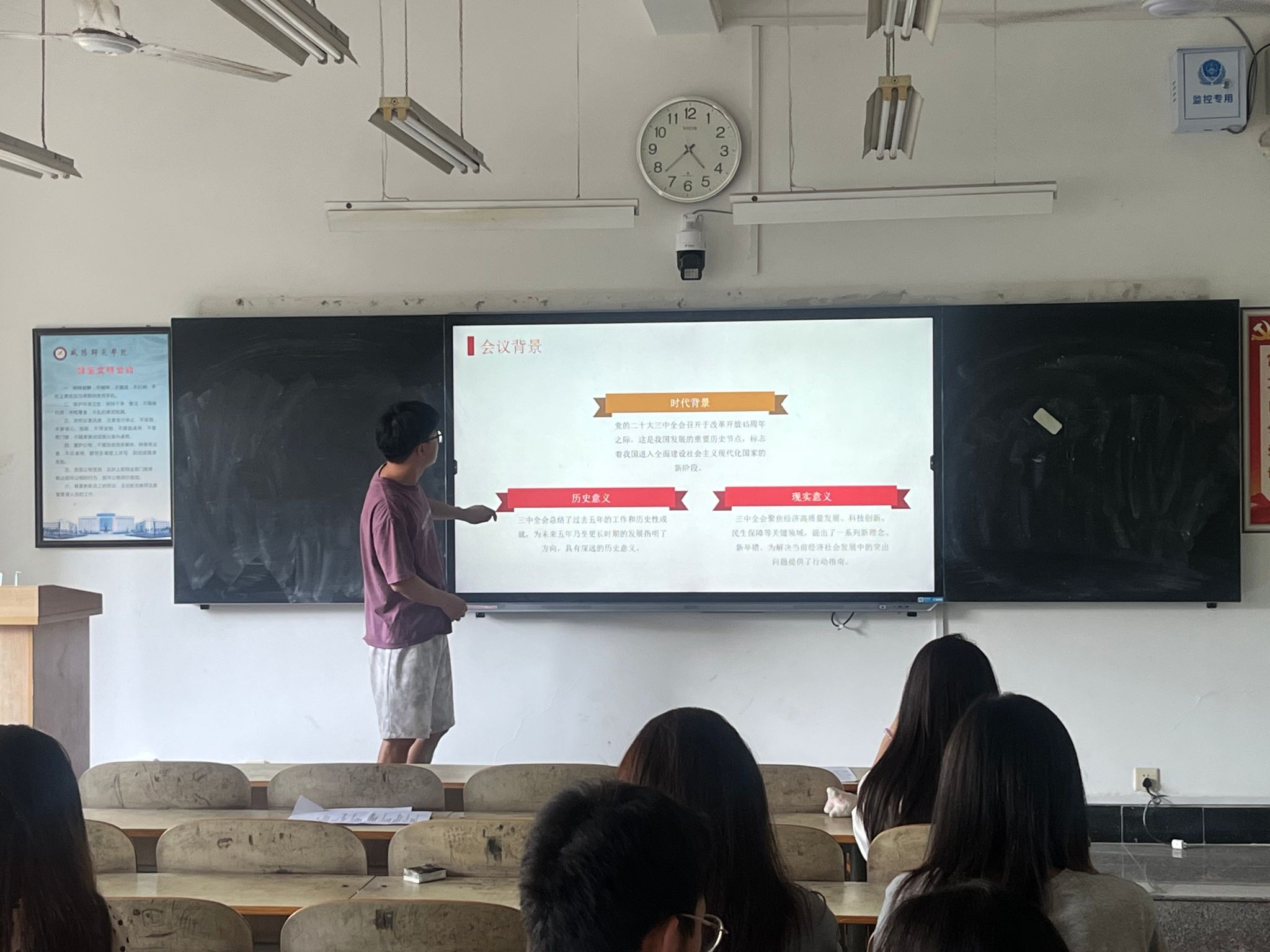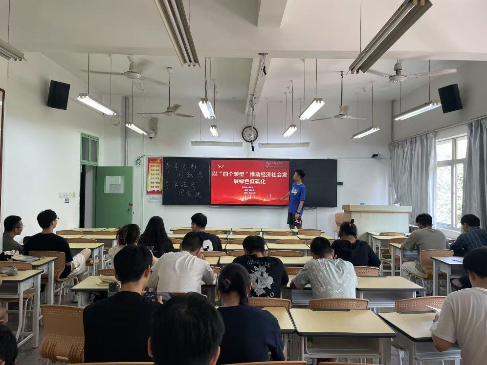 员工第一党支部阎永贵同志以《以“四个转型”推动经济社会发展绿色低碳化》为主题进行讲述。高质量发展是全面建设社会主义现代化国家的首要任务,推动经济社会发展绿色化、低碳化是实现高质量发展的关键环节,我们青年学子必须坚持以习近平新时代中国特色社会主义思想为指导,深入贯彻党的二十届三中全会精神,全面贯彻习近平经济思想。