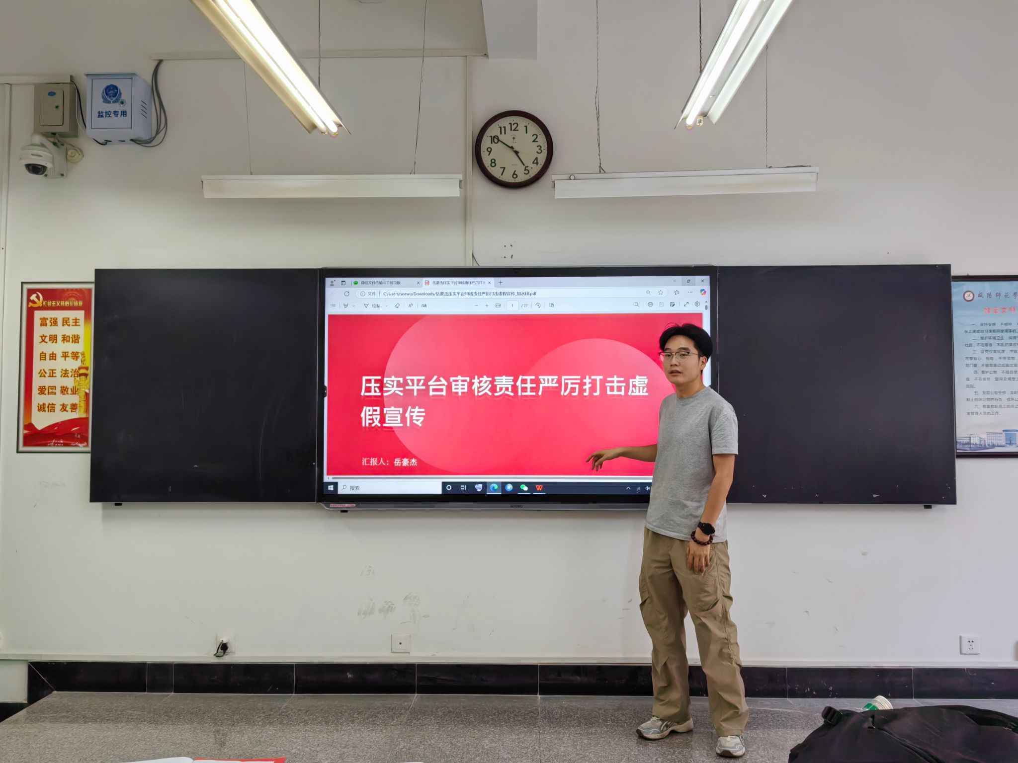 员工第四党支部岳豪杰同志以压实平台审核责任严厉打击虚假宣传为题,讲述在十四届全国人大三次会议首场“部长通道”上,市场监管总局局长罗文回应直播电商乱象。针对部分主播恶意炒作、虚假营销及假冒伪劣产品突出等问题,市场监管部门将压实平台审核责任,加强产品质量抽检,加大监管执法力度,严厉打击虚假广告、虚假宣传行为。同时,今年还将制定出台《直播电商监管办法》,建立长效监管机制,维护公平竞争秩序 ,保障消费者权益。