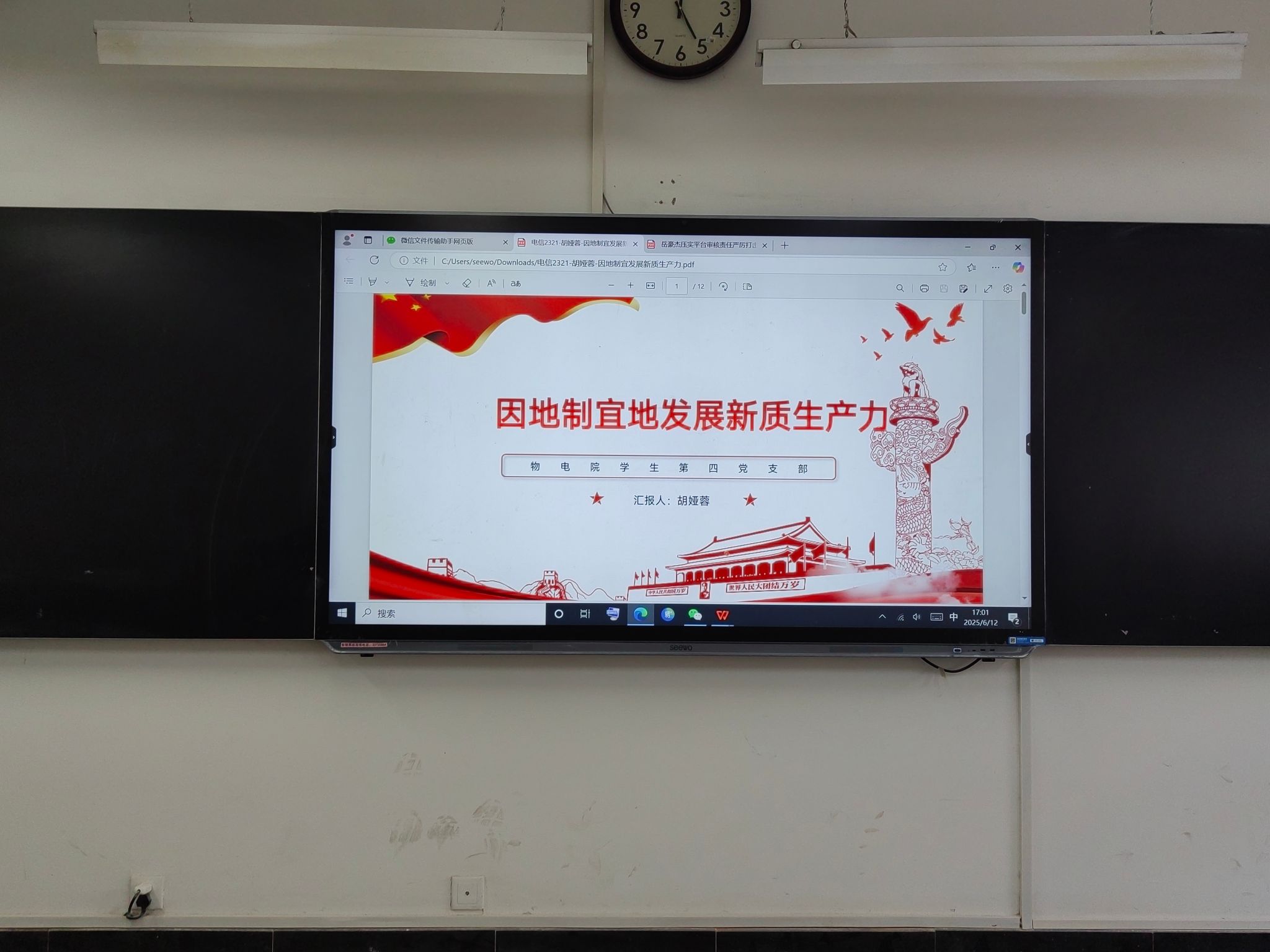 员工第四党支部胡娅蓉以因地制宜地发展新质生产力为题,讲述因地制宜发展新质生产力是建设现代化产业体系的关键。各地需立足自身优势,培育壮大商业航天、低空经济等新兴产业,前瞻布局生物制造、量子科技等未来产业;同时运用数字技术推动传统产业智能化、绿色化改造升级。国家将加大科技投入,培养高素质人才,打造开放包容的创新生态,通过统筹产业布局,激发数字经济活力,推动新质生产力赋能经济高质量发展。