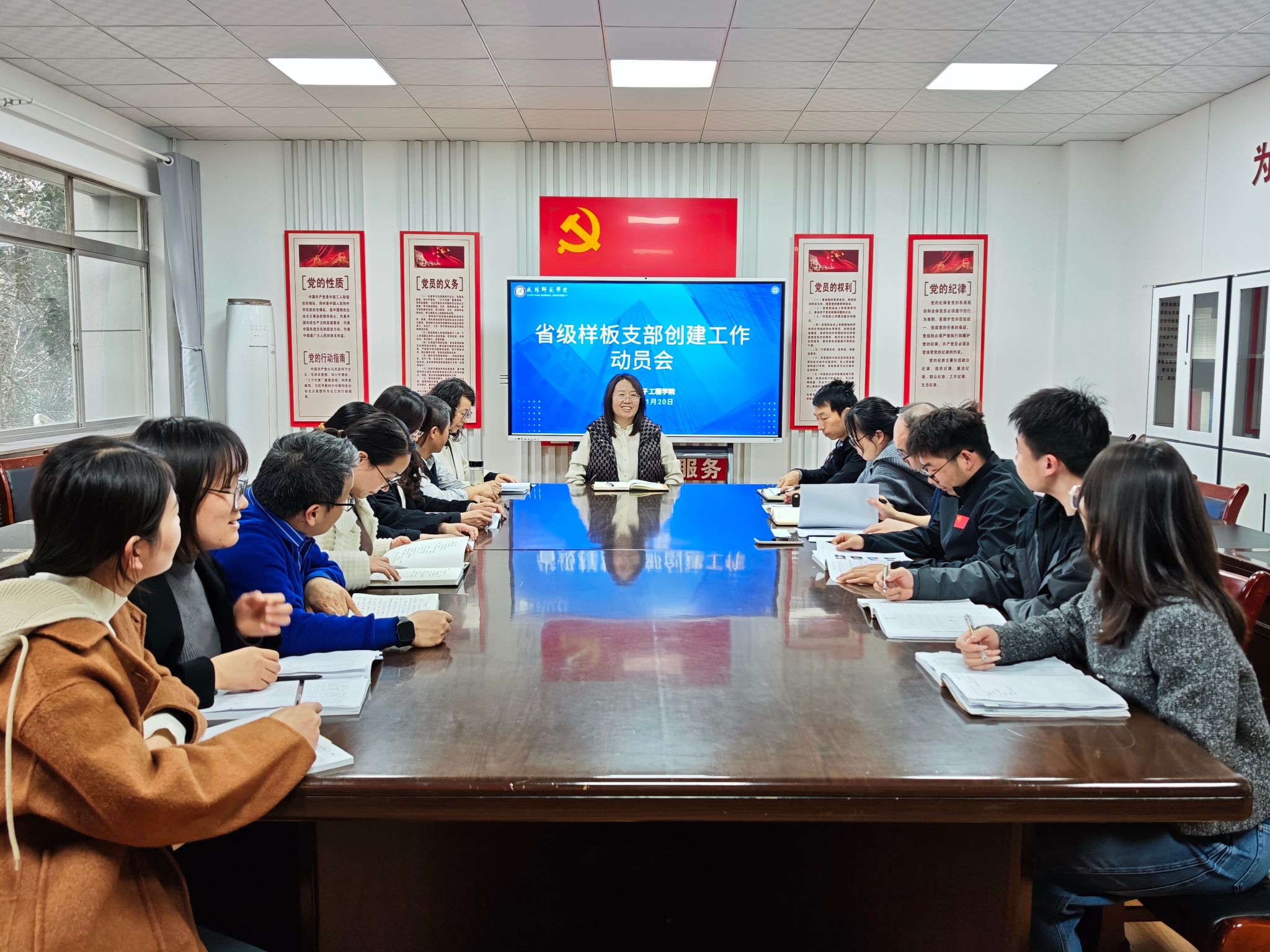 会上,袁月传达上级党建“双创”工作部署,解读省级样板支部创建指标与实施方案,明确创建目标、任务清单与时间节点,强调以政治建设为统领,聚焦支部班子、党员队伍、组织生活、作用发挥等关键环节,推动党建与教学科研、人才培养、管理服务深度融合。