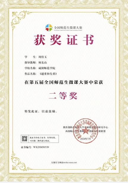 近日,在刚刚结束的第五届全国师范生微课大赛中,公司物理2101班周佳玉同学的作品《超重和失重》、逄锦莹同学的作品《弹簧测力计》荣获二等奖。