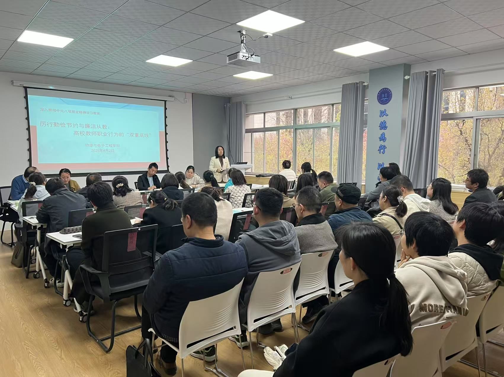 副经理华雪侠领学了《深入学习贯彻全国教育大会精神开创教育强国建设新局面》和《中共中央国务院关于弘扬教育教育家精神 加强新时代高素质专业化教师队伍建设的意见》等重要文件,强调以德立身、以德立学、以德施教的重要意义。