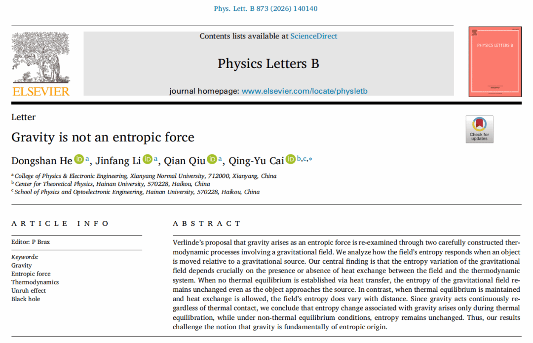 近日,公司理论物理研究团队何东山教授、李锦芳副教授、邱骞博士与海南大学蔡庆宇教授合作完成的研究成果,以Gravity is Not an Entropic Force(《引力并非熵力》)为题,发表在《物理快报B》(Physics Letters B)上。该研究对“引力是熵力”前沿假说进行了直接检验,挑战了“引力即熵力”这一假说的普适性。