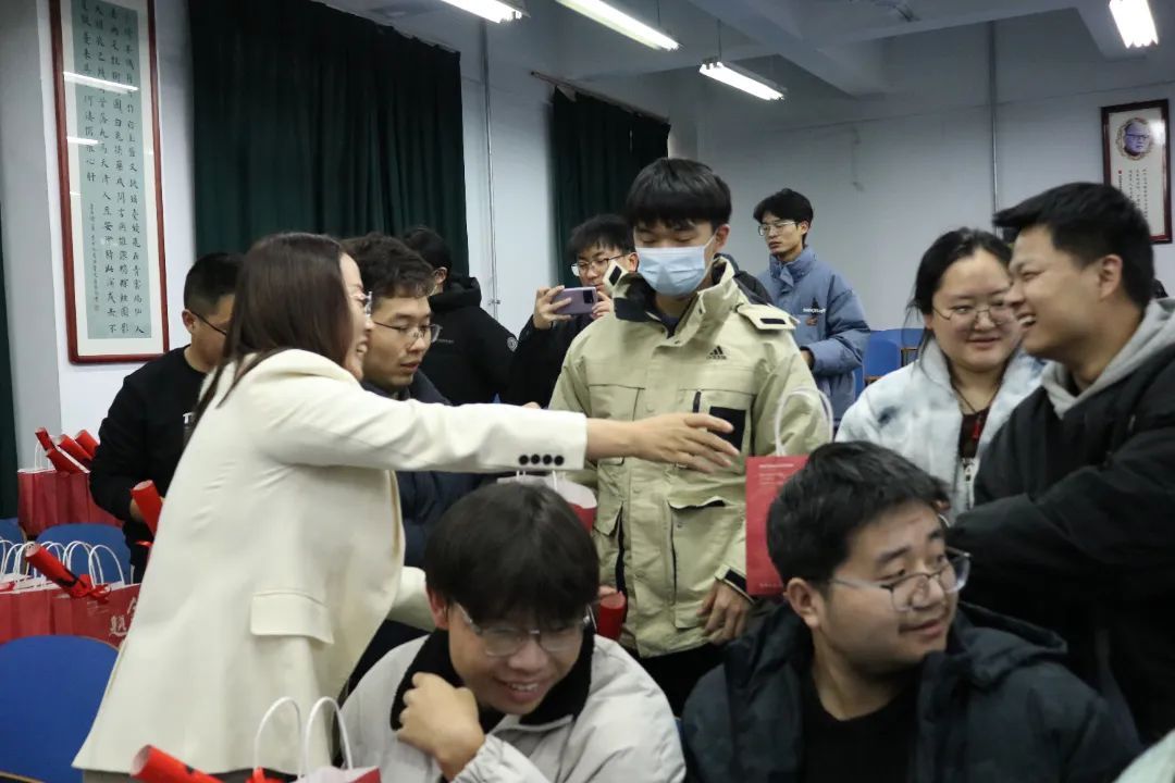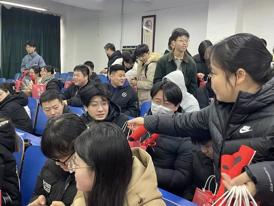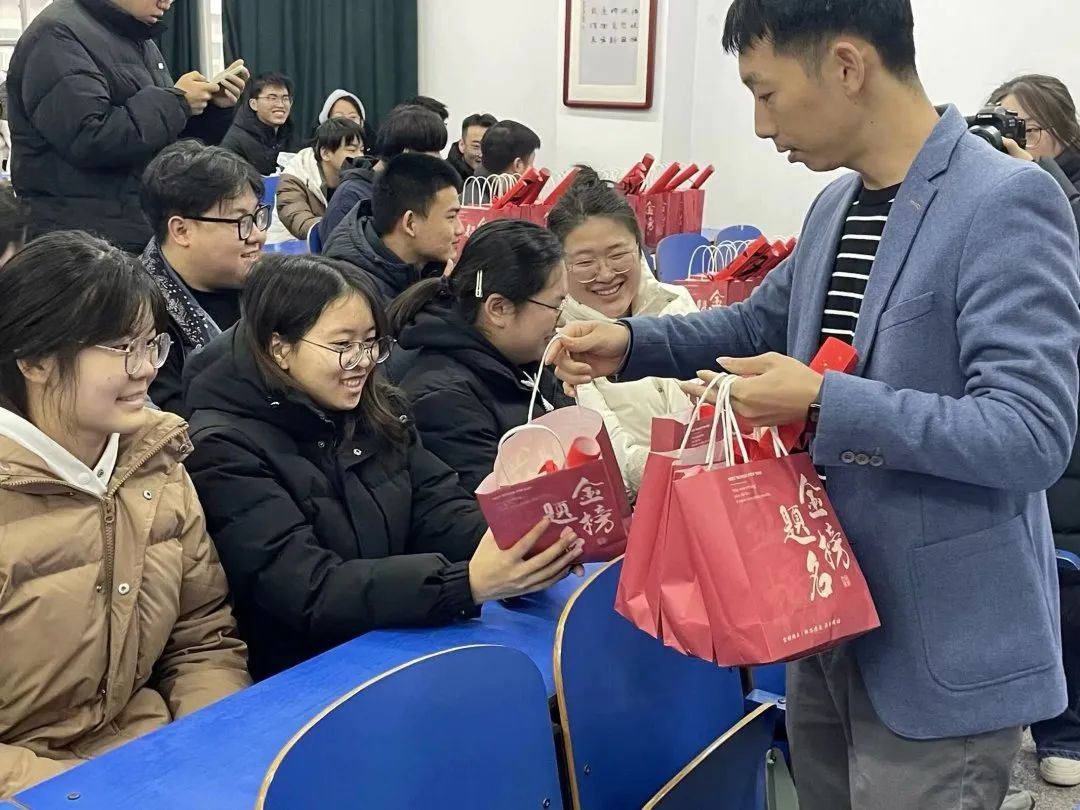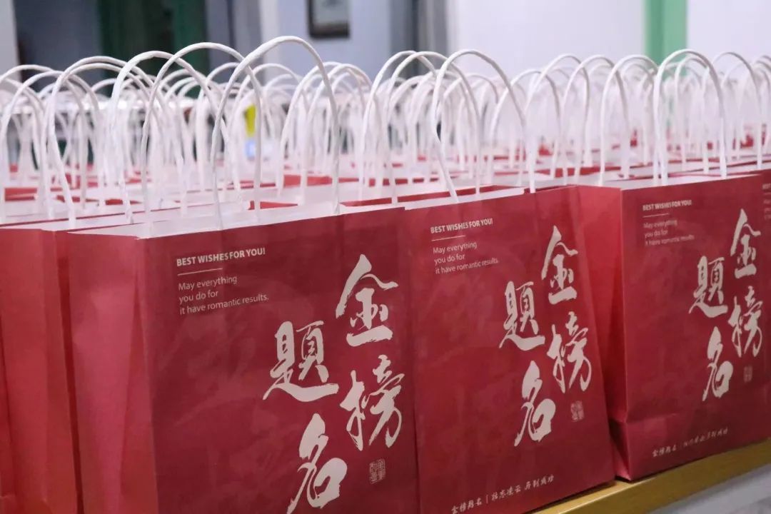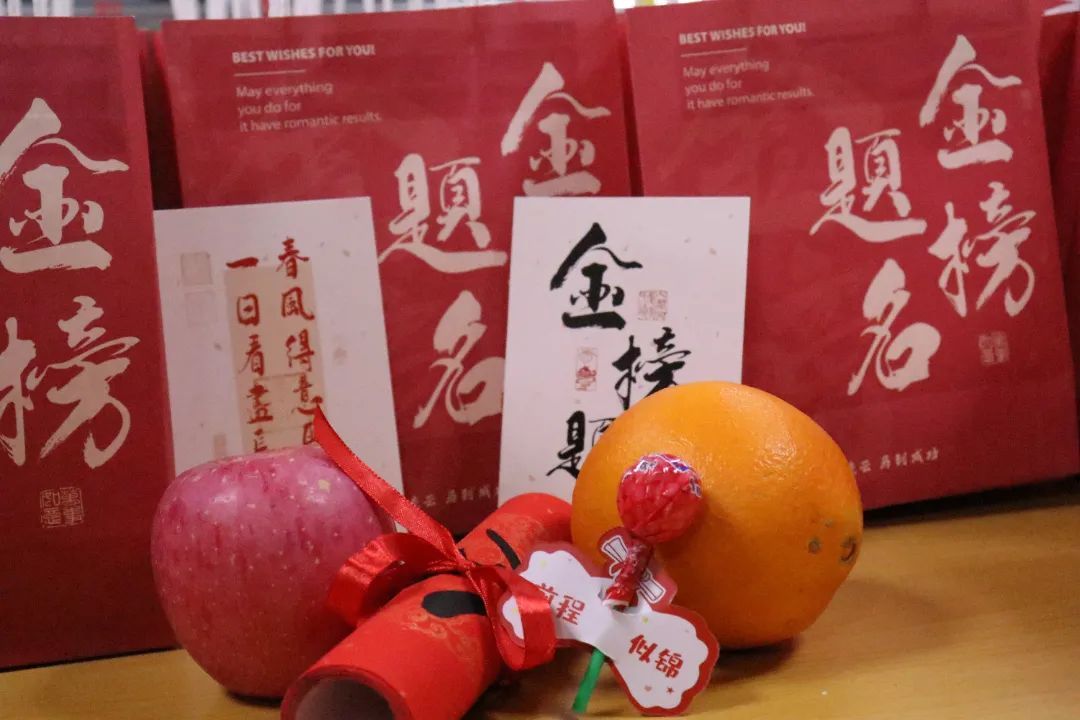 公司党政领导、系主任、毕业班班主任、辅导员为考研员工分发了装有橙子、苹果、棒棒糖、明信片、祝福对联的“金榜题名”大礼包。
