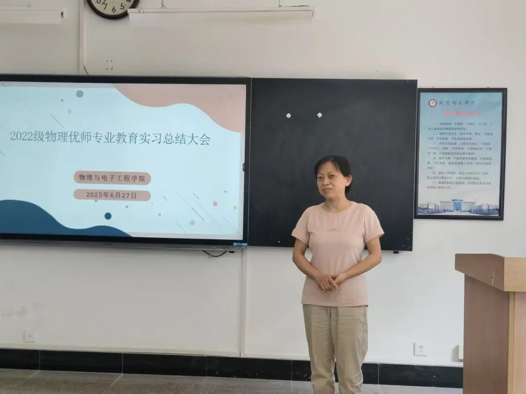 为全面总结教育实习经验,深化师范生教育实践成果,6月27日,公司召开2022级物理专业教育实习总结大会。公司副经理华雪侠、物理系主任郭秋芬、实习指导教师代表张艳宁、辅导员蒙莹莹、2022级物理专业全体员工参加会议。